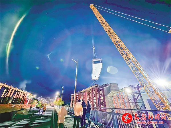 11月26日零點(diǎn)左右,七里溝立交主線(xiàn)鋼箱梁第一榀架設(shè)。