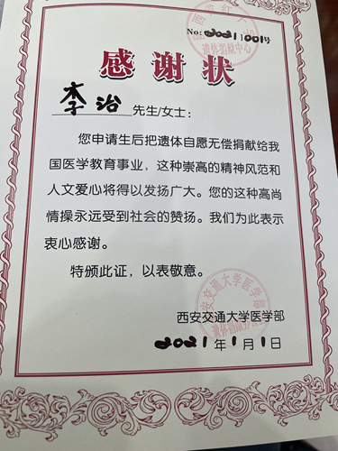 15年來,李治還積極資助困難學生、為災(zāi)區(qū)捐資捐物,為他人、為社會付出了很多,但他總覺得不夠。2021年,他自愿申請并成功登記為遺體捐獻志愿者。“這是我那年送給自己的新年禮物。”他指著西安交通大學醫(yī)學部的感謝狀說。