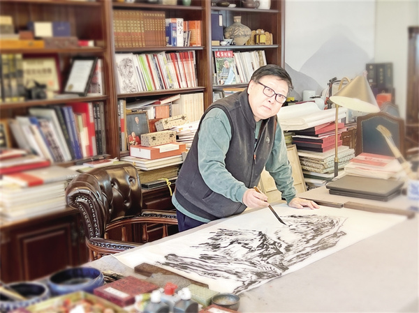 在安康,穆家善這樣介紹他最得意的焦墨千毫皴:“我創(chuàng)作的焦墨千毫皴,就是改變了傳統(tǒng)的毛筆的使用方法,用西方的一種藝術(shù)觀點(diǎn)來說,一種畫風(fēng)的改變或者一種畫技的改變,其實(shí)就是一種新的思想和流向,我的千毫皴,作畫時(shí)千豪齊發(fā)的感覺,正好符合今天我們中國人的時(shí)代精神,有一種自毫感和幸福感。我們中國傳統(tǒng)文化追求天人合一,我覺得作畫追求的最高境界就是靜,我也希望自己的作品能給受眾一種安靜和諧的意味,這也正是中國傳統(tǒng)文化的精髓所在。”