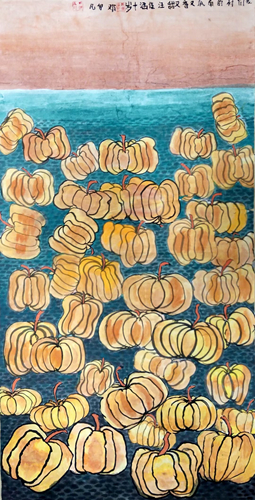 畫面上緊密排列的南瓜,給人一種飽滿、充實(shí)的視覺感受,顯示了收獲的豐盛,也表達(dá)出一種對富足生活的滿足和喜悅之情。汪佳涵選擇了家鄉(xiāng)常見的農(nóng)作物作為自己的繪畫主題,直白地表達(dá)了對家鄉(xiāng)的認(rèn)可和贊美,展示了她對家鄉(xiāng)生活的認(rèn)同和熱愛。