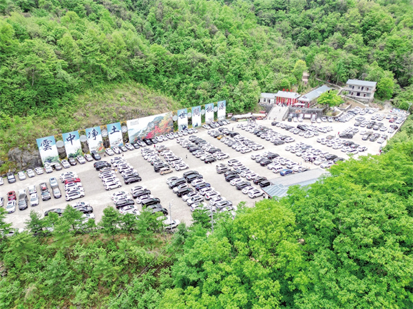 “五一”假期,嵐皋縣南宮山景區(qū)持續(xù)火爆。圖為“滿員”的北線停車(chē)場(chǎng)。 陳陽(yáng) 攝