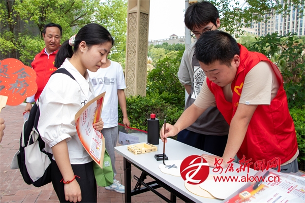 “翰墨飄香,助力高考”書法創(chuàng)作活動中,書法愛好者揮毫?xí)荆瑢㈧`動筆墨化作滿滿的祝福,為考生加油鼓勁。
