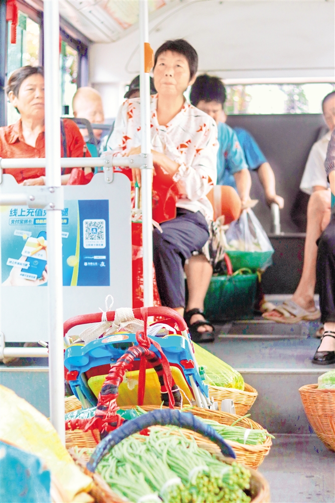 “滴——公益卡。”他刷完卡后,迅速掃視車廂,先把菜筐放在后門邊的空檔處,確保下車快,然后眼疾手快地“占領(lǐng)”了靠近后門的座位。“今兒人少,運氣好!”搶到這個座位,意味著他能早早抵達(dá)市場,在人流涌來前,占一個靠前又光線好的攤位。這可是兩筐菜賣個好價錢的開端。