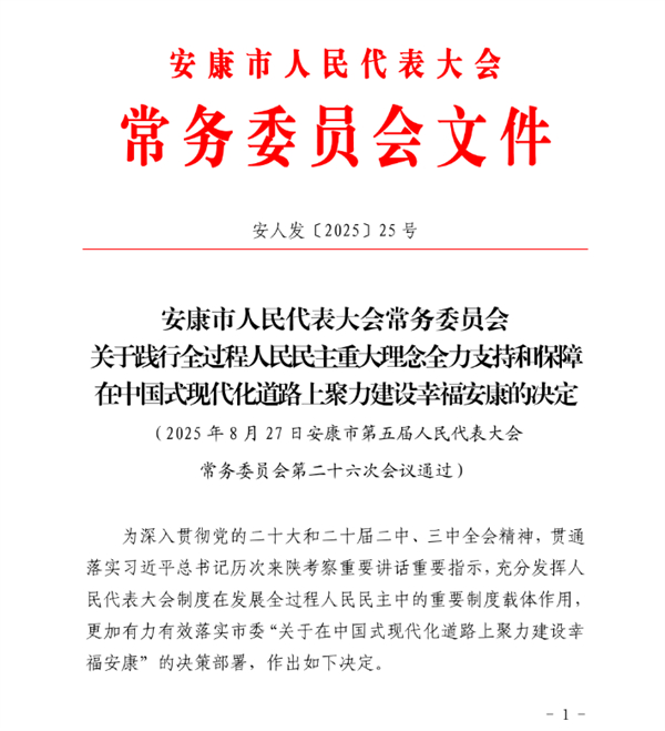 本網(wǎng)訊(通訊員 周清華 張凡)8月27日,安康市五屆人大常委會(huì)第二十六次會(huì)議作出《安康市人民代表大會(huì)常務(wù)委員會(huì)關(guān)于踐行全過程人民民主重大理念全力支持和保障在中國(guó)式現(xiàn)代化道路上聚力建設(shè)幸福安康的決定》(以下簡(jiǎn)稱《決定》),并自印發(fā)之日起實(shí)施。以地方人大常委會(huì)作出重大事項(xiàng)決定的形式,將黨的主張通過法定程序轉(zhuǎn)化為全體人民的共同意愿,是安康市人大常委會(huì)強(qiáng)化擔(dān)當(dāng)、依法履職的創(chuàng)新實(shí)踐,是圍繞中心、服務(wù)大局的務(wù)實(shí)舉措,必將為在中國(guó)式現(xiàn)代化道路上聚力建設(shè)幸福安康注入堅(jiān)實(shí)的人大力量。