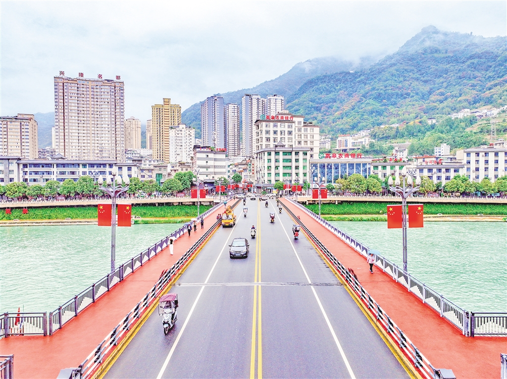 在嵐皋縣大橋兩側(cè),一面面整齊的五星紅旗迎風(fēng)飄揚(yáng),喜迎國慶。