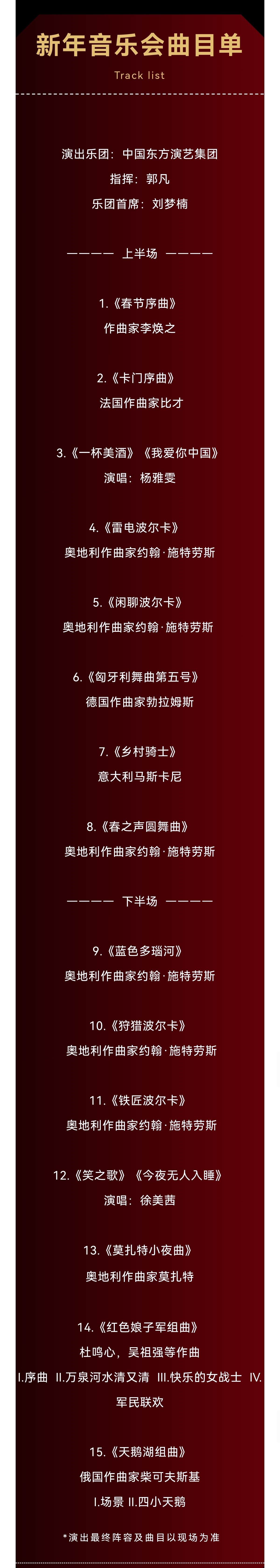 本場(chǎng)音樂(lè)會(huì)以“喜迎新年”為篇章,精粹二十首左右的中外“新年代表”經(jīng)典樂(lè)曲,獨(dú)具中國(guó)東方韻味的名曲和維也納新年音樂(lè)會(huì)的傳統(tǒng)樂(lè)曲,曲目中西合璧,加入極富創(chuàng)意的樂(lè)曲編排,歡快宏大、激情洋溢的音樂(lè)風(fēng)格,讓跨年氛圍與交響融合得渾然一體,在歡樂(lè)喜悅的音樂(lè)旋律中表達(dá)對(duì)新年新氣象的期盼與向往。