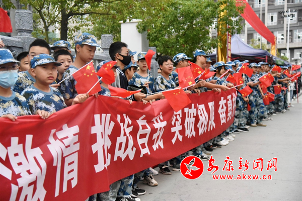 7時30分,校門兩側(cè)早已站滿了初一的學(xué)弟學(xué)妹們,他們揮動著手中的小紅旗,為即將遠(yuǎn)足的哥哥姐姐們加油助威。浩浩蕩蕩的隊伍,在軍訓(xùn)教官以及校領(lǐng)導(dǎo)、老師們的帶領(lǐng)下,踏上遠(yuǎn)足的征途。整齊的迷彩方隊,豎起的一面面班旗,成為晨曦中最亮麗的風(fēng)景。同學(xué)們精神抖擻,一路歡歌,一路笑語,口號聲、吶喊聲此起起伏。