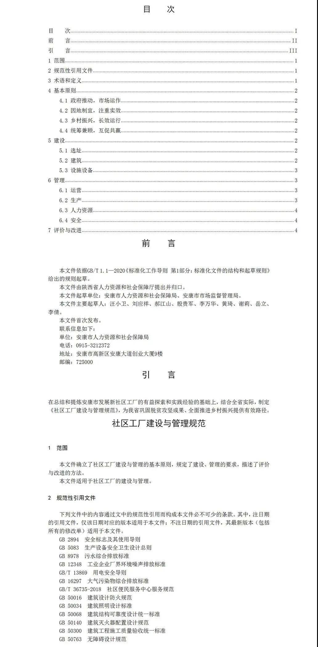 2020年6月,安康市人社局申請陜西省地方標準的立項,同年7月,陜西省市場監(jiān)督管理局批準同意該標準制定。安康市人社局聯合安康市市場監(jiān)督管理局共同成立標準起草組,形成標準草案。歷時兩年時間在全省范圍內實地調研,通過書面征求意見,反復修訂完善,專家評議審查等程序,最終形成報批稿。該標準分別從范圍、規(guī)范性引用文件、術語與定義、基本原則、建設、管理、評價與改進等七方面對社區(qū)工廠的建設與管理予以規(guī)范明確。
