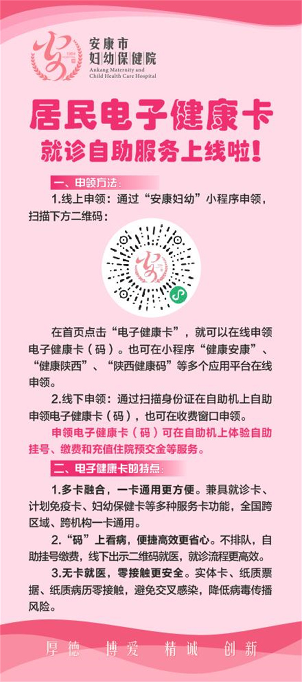 安康市婦幼保健院在醫(yī)院門診一樓大廳配備了智能醫(yī)療掛號繳費終端,并在上線前期,組織了相關(guān)醫(yī)護人員開展操作培訓(xùn)及就診人員門診自助就診演練,同時設(shè)立電子健康卡優(yōu)質(zhì)服務(wù)導(dǎo)醫(yī)服務(wù)臺進行推廣,引導(dǎo)就診人員使用電子健康卡(碼),并廣泛征求或收集群眾建議意見,不斷優(yōu)化電子健康卡(碼)操作流程。就診人員持二代身份證,在醫(yī)院智能醫(yī)療掛號繳費終端、掛號窗口可申領(lǐng)紙質(zhì)健康卡(碼),也可在“安康婦幼”、“健康陜西”、“健康安康”和“陜西健康碼”等多個微信小程序應(yīng)用平臺中線上申領(lǐng)電子健康卡(碼),并可實現(xiàn)線下和線上同步掛號、就診、繳費、取藥、查詢健康檔案等“一碼通”服務(wù)。