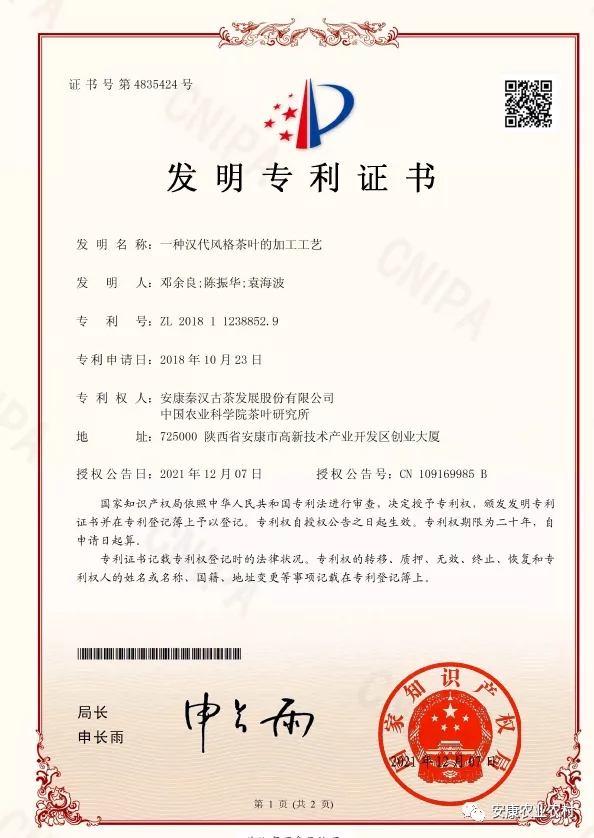 近日,由安康秦漢古茶發(fā)展股份有限公司和中國農(nóng)業(yè)科學(xué)院茶葉研究所聯(lián)合申報的發(fā)明專利“一種漢代風(fēng)格茶葉的加工工藝”獲得國家知識產(chǎn)權(quán)局授權(quán)(專利號:ZL201811238852.9),自此安康最早的茶有了法律保障(專利法)。