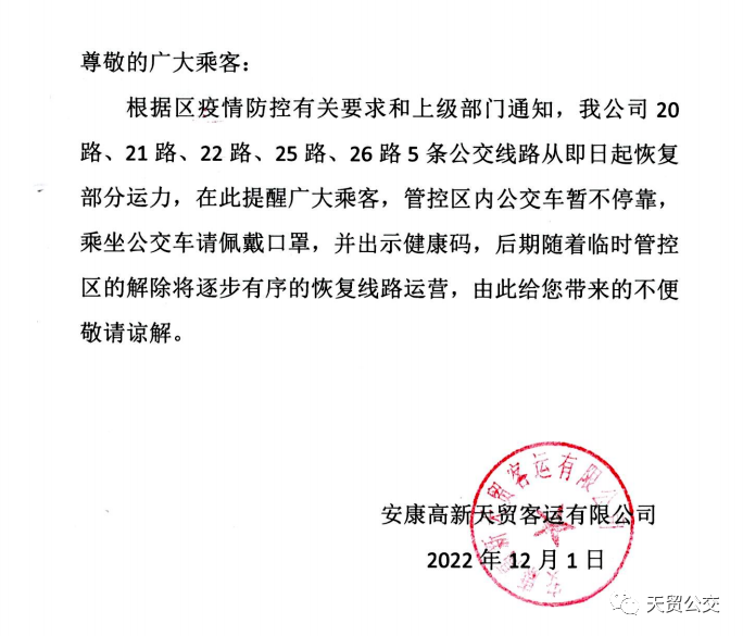 按照市道路運輸服務中心印發(fā)的《中心城市有序恢復公交、出租客運行業(yè)運輸服務工作的實施方案》要求,為更好滿足復工復產(chǎn)和市民出行需求,自12月1日12:00起,我公司1路、3路、4路、5路、9路、12路、13路、16路8條公交線路恢復營運,車輛趟次隨運營需求逐步增加,其他線路逐步有序恢復。2sh安康新聞網(wǎng)