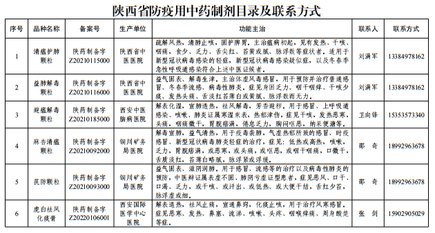 一是全市具有相關(guān)調(diào)劑品種使用需求且符合資質(zhì)的醫(yī)療機構(gòu)均可從《陜西省防疫用中藥制劑目錄及聯(lián)系方式》(詳見附件)中的醫(yī)療機構(gòu)購進目錄中的13種制劑產(chǎn)品,調(diào)劑使用時間從發(fā)文之日起至 2023年6月30日。