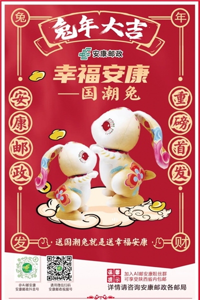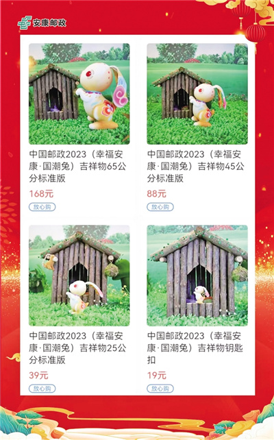 目前該產(chǎn)品有四款規(guī)格:12厘米的鑰匙扣(包掛或車掛);25厘米手辦禮物玩偶;45厘米中型玩偶;65厘米收藏級(jí)玩偶。為滿足更多的群眾需求,安康郵政打通內(nèi)外部平臺(tái),搭建線上線下銷售渠道,線下在郵政各網(wǎng)點(diǎn)、合作單位宣傳展示;線上通過(guò)京東商城、Ai郵安康抖音等全面推廣。結(jié)合即將來(lái)臨的春節(jié)氛圍營(yíng)造,安康郵政各營(yíng)業(yè)網(wǎng)點(diǎn)特別布置了“玉兔呈祥·幸福安康”打卡專區(qū),供喜愛(ài)國(guó)潮毛絨玩具的廣大群眾打卡留念,為癸卯年新春的到來(lái)新增了更多喜慶祥和的氛圍。