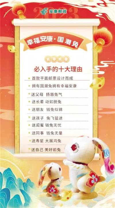 安康毛絨玩具產(chǎn)業(yè)自2017年以來(lái)成為全國(guó)脫貧攻堅(jiān)的典范,現(xiàn)已成為全國(guó)第四大毛絨玩具生產(chǎn)基地。在2023癸卯年到來(lái)之際,為有效將中國(guó)集郵文化與安康毛絨玩具產(chǎn)業(yè)發(fā)展相結(jié)合,將文化資源轉(zhuǎn)化為能看得見(jiàn)、摸得著的文化創(chuàng)意產(chǎn)品,促進(jìn)安康毛絨玩具產(chǎn)業(yè)振興,安康市郵政分公司聯(lián)合恒口毛絨玩具五大運(yùn)營(yíng)中心,結(jié)合生肖郵票文化資源, 以“有型、有情、有意”為理念,在全國(guó)首創(chuàng)開(kāi)發(fā)了“幸福安康·國(guó)潮兔”毛絨潮玩。