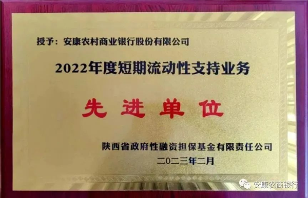 4月12日,安康農(nóng)商銀行喜獲2022年度短期流動(dòng)性支持業(yè)務(wù)先進(jìn)單位殊榮,安康農(nóng)商銀行黨委副書(shū)記、行長(zhǎng)被授予2022年度短期流動(dòng)性支持業(yè)務(wù)先進(jìn)個(gè)人表彰。榮譽(yù)的取得不僅代表了安康農(nóng)商銀行在短期流動(dòng)性支持業(yè)務(wù)開(kāi)展及金融助力小微企業(yè)健康發(fā)展方面得到的充分認(rèn)可,也標(biāo)志著安康農(nóng)商銀行在穩(wěn)健經(jīng)營(yíng)、持續(xù)發(fā)展的道路上邁出的又一堅(jiān)實(shí)步伐。