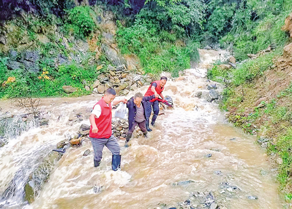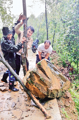 ⇑ 9月19日,石泉縣曾溪鎮(zhèn)境內(nèi)普降大雨,駐村工作隊(duì)連同大溝村干部下沉一線排險(xiǎn)搶險(xiǎn)。文倩 丁浩哲 攝