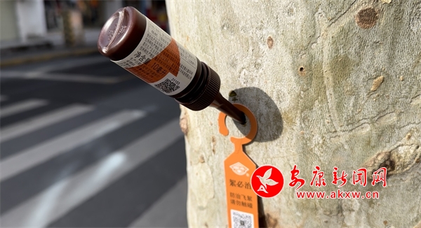 在城區(qū)育才路,市政園林工作人員先在法桐的樹干上斜鉆出一個(gè)數(shù)厘米深的小洞,然后把一支褐色瓶子插在樹洞中。安康市市政園林處綠化管護(hù)科副科長龔晨曦介紹,給法桐注射的藥物名叫“絮必治”,通過插瓶輸液法,在樹干打孔,把藥劑輸入樹體內(nèi),藥劑會隨著蒸騰作用擴(kuò)散到樹體各部分,抑制花芽形成,從而不開花結(jié)果,達(dá)到控制懸鈴木飛絮的目的。今年計(jì)劃對城區(qū)500株法桐進(jìn)行試點(diǎn)打藥,其原理就是通過藥物不讓果實(shí)成熟,也就不會有飛絮。同時(shí)也會采用修剪枝葉、夏季夜間高壓水槍噴水等方式,最大限度緩解法桐飛絮漫天飛舞擾民的現(xiàn)象,逐年逐步減少對市民的影響。