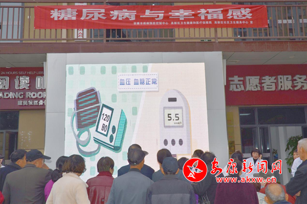 活動(dòng)圍繞“糖尿病與幸福感”主題,通過(guò)懸掛橫幅、免費(fèi)測(cè)血壓和血糖、循環(huán)播放糖尿病防治視頻、發(fā)放宣傳資料和支持性工具,市疾控中心工作人員向社區(qū)居民介紹了糖尿病的常見(jiàn)癥狀,日常生活中怎么預(yù)防糖尿病,糖尿病治療的“五駕馬車”,即健康教育、合理飲食、適量運(yùn)動(dòng)、規(guī)律用藥、自我監(jiān)測(cè)。共計(jì)發(fā)放各類宣傳品1500余份,測(cè)血壓血糖100人。