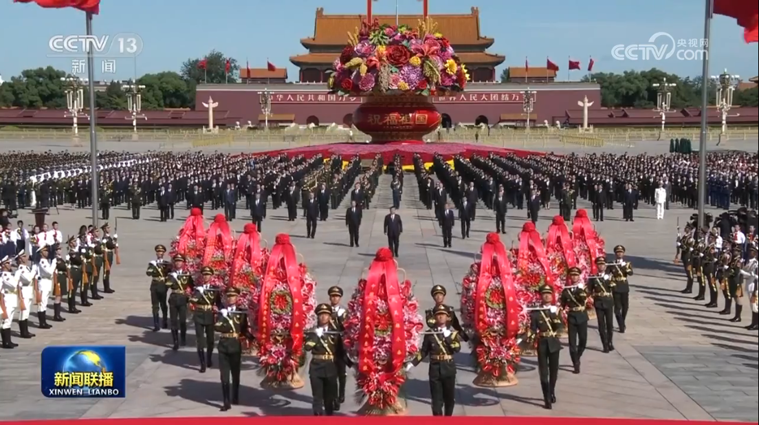 方陣前,以中共中央,全國人大常委會,國務(wù)院,全國政協(xié),中央軍委,各民主黨派、全國工商聯(lián)和無黨派愛國人士,各人民團(tuán)體和各界群眾,老戰(zhàn)士、老同志和烈士親屬,中國少年先鋒隊名義敬獻(xiàn)的9個大型花籃一字排開,花籃紅色緞帶上書寫的“人民英雄永垂不朽”格外醒目。