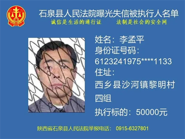 為了進(jìn)一步加大執(zhí)行力度,保障勝訴當(dāng)事人的合法權(quán)益,推進(jìn)社會(huì)誠(chéng)信體系建設(shè),依照《中華人民共和國(guó)民事訴訟法》《最高人民法院關(guān)于公布失信被執(zhí)行人名單信息的若干規(guī)定》等法律、司法解釋的有關(guān)規(guī)定,現(xiàn)對(duì)一批已進(jìn)入執(zhí)行程序,且尚未全部履行義務(wù)的被執(zhí)行人進(jìn)行媒體曝光,歡迎廣大群眾支持石泉縣人民法院的工作,向我院提供被執(zhí)行人的財(cái)產(chǎn)線索,使生效法律文書能夠得到切實(shí)執(zhí)行,讓人民群眾切實(shí)感受到公平正義就在身邊。