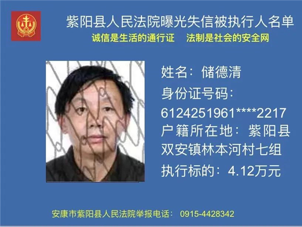 被執(zhí)行人儲德清,你因不履行(2017)陜0924民初241號民事判決書確定的義務(wù),已被紫陽縣人民法院納入失信被執(zhí)行人名單庫依法進(jìn)行信用懲戒。信用懲戒范圍包括但不限于以下措施: