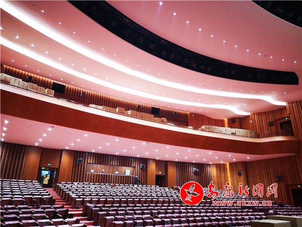大廳右側為大劇場,左側為小劇場。大劇場的舞臺長33.6米,高24.2米,舞臺正前方配有一個長14.3米、寬13.3米的升降舞臺,劇場內(nèi)可同時容納1200人觀看演出。小劇場舞臺長18.3米,高11.3米。共有座位307個,內(nèi)部設施安裝已基本完成。