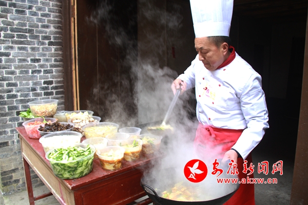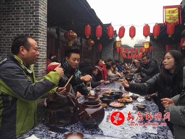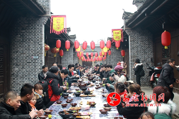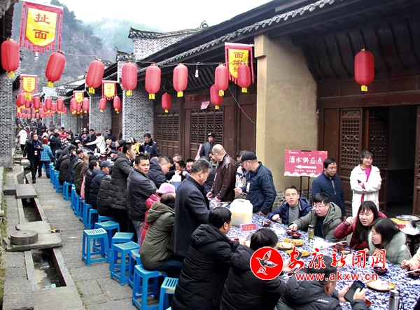 為讓各地游客品嘗到美味的漢陰名小吃,活動(dòng)現(xiàn)場(chǎng)還舉辦了富硒美食品鑒活動(dòng)。游客可通過競(jìng)猜答題、幸運(yùn)抽獎(jiǎng)等方式,參與品嘗漢陰特色美食,零距離感受陜菜之鄉(xiāng)的文化氣息。在人氣爆棚的古鎮(zhèn)長桌庖湯宴上,百米長桌,游客相對(duì)而坐,特色泥碗盛滿香甜美酒,當(dāng)?shù)赜慰鸵云洫?dú)特的“陜南酒拳”與親朋“切磋”助興。本次庖湯宴包含6個(gè)地方?jīng)霾恕?0個(gè)特色熱菜和2個(gè)養(yǎng)生燉菜,“金豬送福”、“肝膽香爪”、“翡翠白菜”......一道道精心準(zhǔn)備的菜肴讓各地游客既感心意、又獲暖意,F(xiàn)場(chǎng)參與庖湯宴的游客不僅能享用美食,還能獲贈(zèng)新春對(duì)聯(lián)一副,收獲滿滿的古鎮(zhèn)祝福。