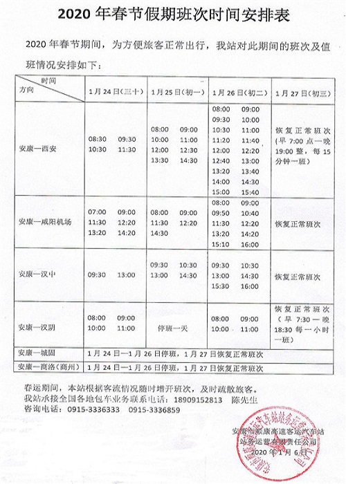 本網(wǎng)訊(實(shí)習(xí)記者 雷文鈺)2020年春節(jié)即將來(lái)臨,節(jié)假日期間的車(chē)輛班次成了大家關(guān)注的焦點(diǎn),為方便旅客的正常出行,安康高速客運(yùn)站特對(duì)春節(jié)期間安康到西安、咸陽(yáng)機(jī)場(chǎng)、漢中、漢陰、城固以及商洛的班次做了調(diào)整,自2019年1月10日起,發(fā)車(chē)時(shí)間更改如下: