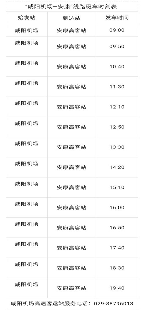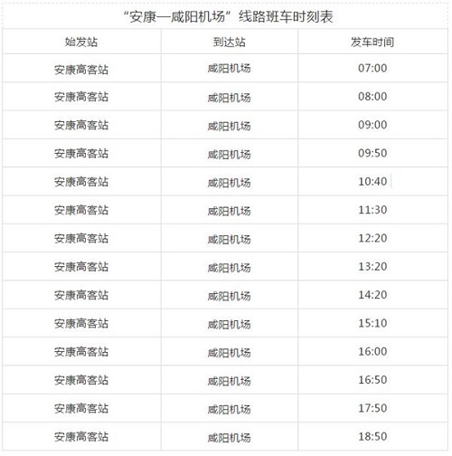 自2019年1月10日起,“安康—咸陽(yáng)機(jī)場(chǎng)”線(xiàn)路的發(fā)車(chē)時(shí)間也做出了更改,具體如下: