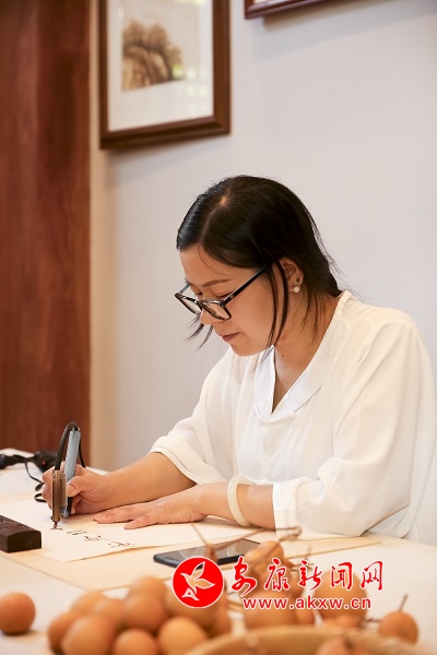 6月24日,李紅霞為安康日報社烙畫作字——“黨媒服務創(chuàng)新在一線”。烙畫又稱火筆畫,中國傳統(tǒng)藝術珍品,用火燒熱烙鐵在物體上熨出烙痕作畫。烙畫創(chuàng)作在把握火候、力度的同時,注重“意在筆先、落筆成形”。