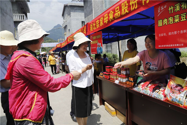 活動現場,鎮(zhèn)坪縣和竹溪縣各具特色的農副產品在竹葉村進行集中展銷,臘肉、茶葉、葵花油、百花蜜以及各種地方特色手工藝品吸引了往來游客紛紛品嘗與購買。