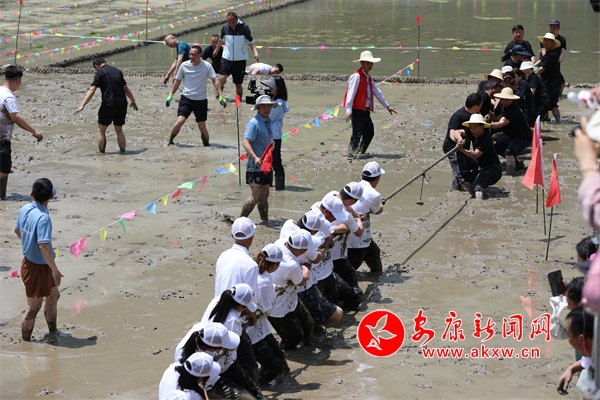 以藍天為背景,水田作舞臺。來自湖北省十堰市、白河縣、旬陽市各鎮(zhèn)和仙河鎮(zhèn)各村(社區(qū))20個隊伍、400名運動員展開一場場運動競賽。只見隊員們挽起褲腳,赤腳下田,放肆追逐,盡情歡呼,插秧比賽、稻田拔河比賽、稻田摔跤比賽、渾水摸魚等環(huán)節(jié),重現(xiàn)歡鬧的勞作場景,上演著一場場關于泥、水、魚和人的快樂“較量”,觀眾也在還原農耕場面原始風俗、熱情勞作和農忙氛圍中找到了童年最純真的模樣。