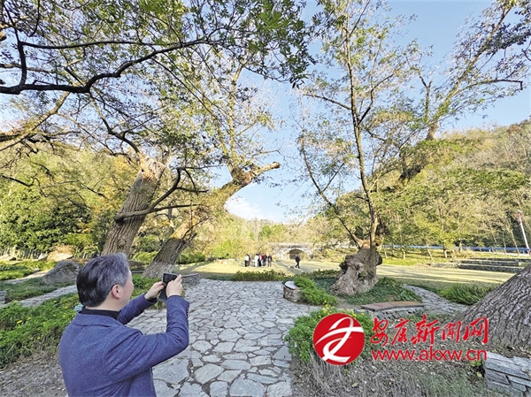 隨后采訪團(tuán)驅(qū)車駛?cè)腚p嶂村,一眼看見高大的“麻柳”古樹。據(jù)悉,這些古樹一共16棵,樹齡約500年。古樹的枝干或挺拔如衛(wèi)士,或斜臥似老者,繁密的枝葉織成巨傘,將整片草坪籠在樹蔭里。樹下游客紛紛舉起相機(jī)拍照,快門聲伴著歡聲笑語。