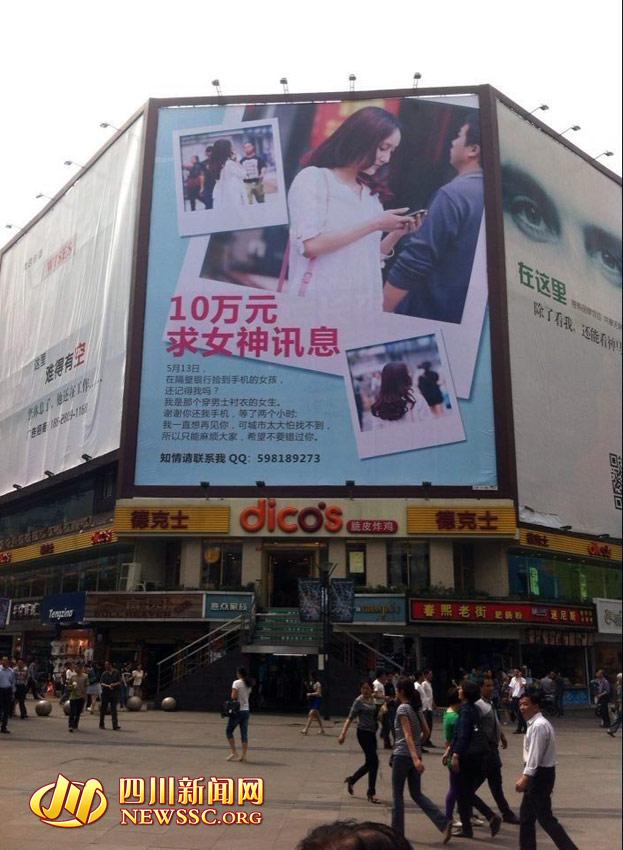 今日上午,成都春熙路太平洋電影院對面,刊登出了一副巨型“尋人啟事”,懸賞十萬,尋找一位一見傾心但沒有留下聯(lián)系方式的女孩。對于這一舉動(dòng),四川新聞網(wǎng)記者隨機(jī)采訪了現(xiàn)場圍觀的市民,大多數(shù)人表示,“肯定是炒作嘛。照片上這個(gè)女生是不是藝人,想紅哦?”但也有圍觀女性表示:“今天是520,登這么大的廣告找心上人,還是挺浪漫的。”