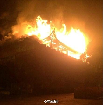 云南大理明代古城樓失火被燒毀