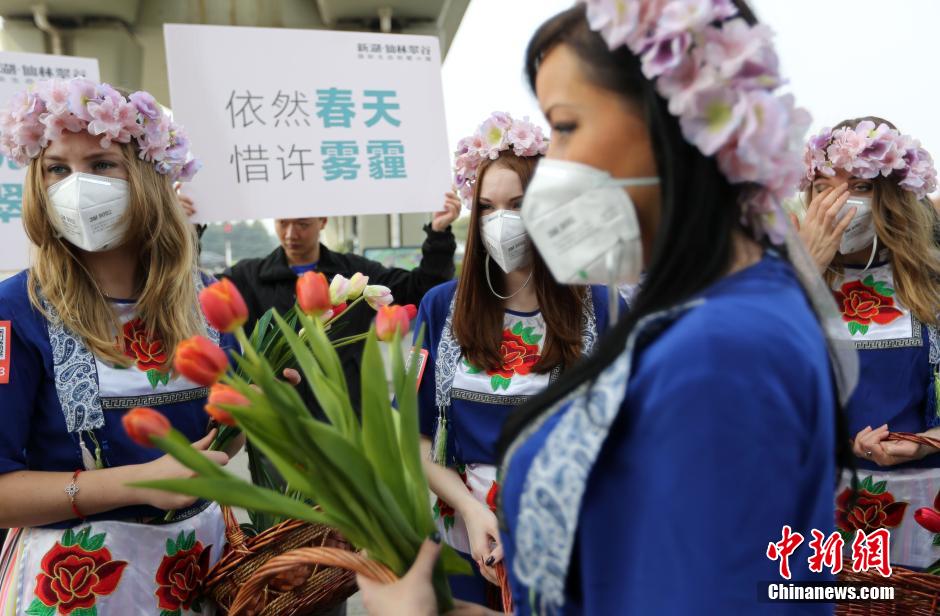 3月30日,六位靚麗“花仙子”統(tǒng)一著裝來(lái)到南京仙林地鐵二號(hào)線沿線新湖仙林翠谷,戴著過(guò)濾式口罩向過(guò)往的市民分發(fā)郁金香,以此提醒人們對(duì)空氣環(huán)境的關(guān)注、倡導(dǎo)綠色環(huán)保生活。中新社發(fā) 泱波 攝Am6安康新聞網(wǎng)