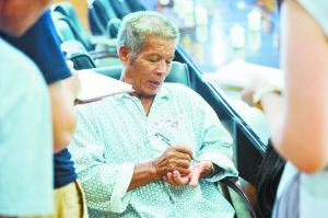 昨日,在兩個弟弟和侄子的陪同下,廖林干來到佛山交警支隊,為幫助他與家人團圓的警官送錦旗致謝。記者看到,身材壯實、膚色黝黑的廖林干穿著醫(yī)院的病號服,頭發(fā)花白的他頭上有一個結(jié)疤的傷口,可正常行走。