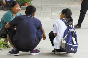 ■家長蹲著囑咐孩子。