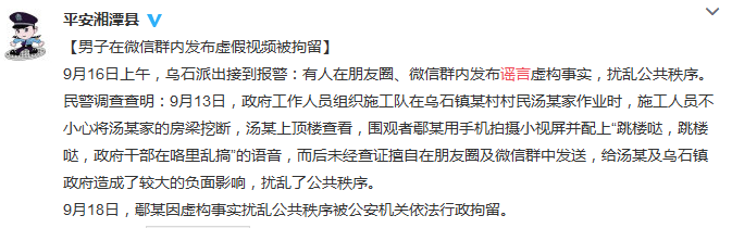 9月19日,湘潭縣警方通過官方微博表示,9月16日上午,烏石派出接到報警電話:有人在朋友圈、微信群內(nèi)發(fā)布謠言,擾亂公共秩序。民警調(diào)查查明:9月13日,政府工作人員組織施工隊(duì)在烏石鎮(zhèn)村民湯某家作業(yè)時,施工人員不小心將湯某家的房梁挖斷。隨后,湯某上頂樓查看,圍觀者鄢某用手機(jī)拍攝小視頻并配上“跳樓噠,跳樓噠,政府干部在這里亂搞”的語音,在未經(jīng)查證的情況下,擅自發(fā)送至朋友圈以及微信群中,給湯某及烏石鎮(zhèn)政府造成了較大的負(fù)面影響。