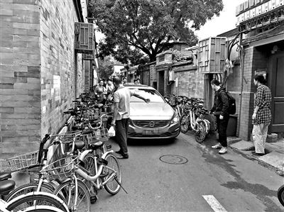 一名在胡同口維持秩序的醫(yī)院保安不時會提醒行人,不要將共享單車停放在醫(yī)院門口,并幫忙將道路中間的共享單車向兩邊靠攏,為路面留出更多空隙。但隨著人數(shù)增多,道路依然不可避免地越來越擠。北青報記者觀察發(fā)現(xiàn),近半個小時的時間里,就有四輛機動車被胡亂停放的單車卡在道路中間,被困車輛甚至連車門都難以打開,只能求助醫(yī)院保安或者周圍居民來挪開車旁的共享單車。8點左右,一名ofo小黃車運營人員在接到醫(yī)院保安的電話后趕到現(xiàn)場。據(jù)他介紹,僅現(xiàn)場的小黃車就需要七八次才能全部搬走,搬出來的單車會被投放在附近其他需要用車的地點,“搬運工作大概會用一上午吧。”