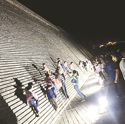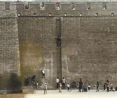 北京青年報(bào)記者在網(wǎng)友提供的照片中看到,正定古城墻外壁的墻磚間形成了一級(jí)級(jí)兩三厘米寬的小臺(tái)階,十幾個(gè)孩童側(cè)著身子、徒手攀爬至兩三米高處,家長(zhǎng)們站在城墻下給孩子拍照,而一旁“禁止攀爬”的警示牌則被無(wú)視。更有成年攀爬者在沒(méi)有保護(hù)措施的情況下,徒手攀爬至六七米高。眾多游客攀爬城墻,遠(yuǎn)看好似攻城,甚至讓部分游客誤以為這是該旅游景點(diǎn)的游樂(lè)項(xiàng)目。