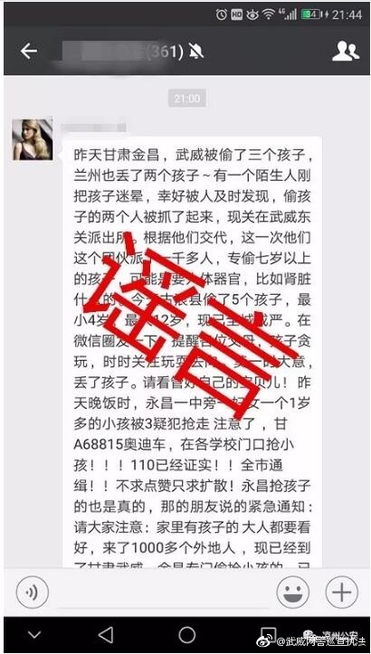28日晚間,甘肅武威網(wǎng)警在官方微博通報(bào)了相關(guān)情況。近日,網(wǎng)警在巡查時(shí)發(fā)現(xiàn)本地朋友圈、微信群傳播一則多個(gè)小孩被偷、被搶的消息,經(jīng)核實(shí),涼州區(qū)及周邊臨縣近期未發(fā)生類(lèi)似案件,也未接到有群眾報(bào)警,更沒(méi)有將搶小孩的嫌疑人關(guān)押在東關(guān)派出所的情況。此消息屬于虛假消息。警方查實(shí),網(wǎng)傳消息與之前國(guó)內(nèi)部分地市傳播的一則偷小孩謠言版本雷同,此謠言只是將外省的地名改成了武威、蘭州、金昌或是古浪等當(dāng)?shù)氐孛?/span>這類(lèi)謠言的傳播,一度引發(fā)部分群眾的恐慌,嚴(yán)重干擾了社會(huì)秩序。