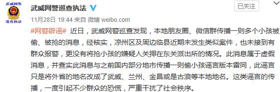 人民網(wǎng)北京11月29日電 (記者孝金波)近日,網(wǎng)絡(luò)有消息稱(chēng)“甘肅金昌武威被偷了三個(gè)孩子……嫌疑人被關(guān)在武威東關(guān)派出所”等內(nèi)容,引發(fā)網(wǎng)民關(guān)注。28日,武威網(wǎng)警辟謠稱(chēng),此消息屬于虛假消息。