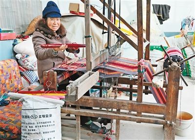 在西安市鄠邑區(qū)玉蟬鎮(zhèn)的一個(gè)村莊里,67歲的農(nóng)婦周妙娃正在使用一臺(tái)四十年多前的土織布機(jī)織環(huán)保床單,土織布機(jī)由木頭制作,這種木質(zhì)結(jié)構(gòu)的土織布機(jī)已經(jīng)有上千年的歷史,村子里以前有不少人織土布。如今,大家都轉(zhuǎn)型種葡萄了,大多數(shù)家都把土織布機(jī)拆了,僅周妙娃家還保留了一臺(tái)。