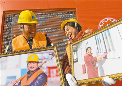 1月9日,北京城市副中心一處安置房工地,農民工夫婦黃春平(左)和曾風在比拼誰的照片更美。v6Y安康新聞網