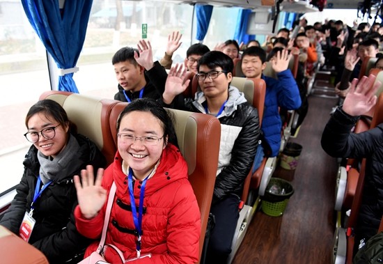 當(dāng)日,2018接阜陽(yáng)籍大學(xué)生回家活動(dòng)在安徽農(nóng)業(yè)大學(xué)啟動(dòng),來(lái)自安徽農(nóng)業(yè)大學(xué)、安徽醫(yī)科大學(xué)、合肥工業(yè)大學(xué)等高校的200余名阜陽(yáng)籍大學(xué)生免費(fèi)乘坐大巴車(chē)返回家鄉(xiāng)過(guò)年。新華社記者 劉軍喜 攝
