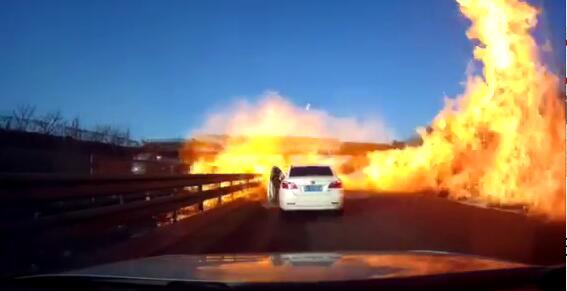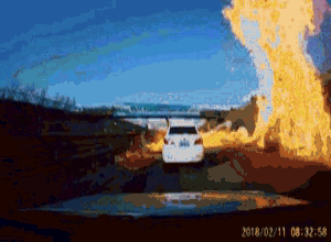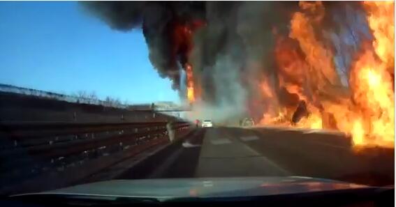 網(wǎng)傳行車記錄儀的視頻顯示,2月11日8時(shí)許,前方高速公路上有一輛油罐車側(cè)翻在地,記錄儀所在車輛停在路中,女司機(jī)說(shuō)“后面(車)不倒我咋倒(車)”。此時(shí)右前方一輛小汽車往油罐車方向開(kāi)了一點(diǎn),正待倒車,突發(fā)巨響,車底爆燃,一瞬即被迅速蔓延的火焰吞沒(méi)。而正前方白色小汽車司機(jī)棄車急速向后奔跑。隨即行車記錄視頻中傳來(lái)所在車中女子的尖叫哭泣聲,有男子催促倒車加油,另有女子安慰。隨著記錄儀所在車輛緊急倒退,視頻中可見(jiàn)高速路旁樹(shù)木綠地成片燃燒,火光沖天。倒車約30秒后,這輛車終于離開(kāi)了起火范圍。