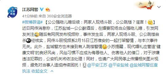 2月26日9時(shí)3 3分,江蘇省公安廳網(wǎng)絡(luò)安全保衛(wèi)總隊(duì)官方微博“江蘇網(wǎng)警”對此辟謠,“經(jīng)核實(shí),網(wǎng)傳斗毆視頻系2月15日江蘇淮安的一起打架警情,與本次事件無關(guān)。此外,鹽城警方也未接到有人跳樓警情!