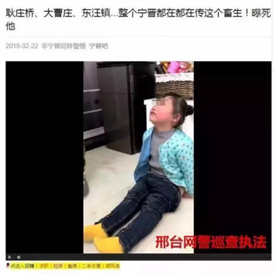 隨后,“父親打女兒”的視頻配上了“某地都在傳這個(gè)畜生!曝死他”等標(biāo)題在各地的微信群、自媒體平臺瘋狂傳播,并配文稱視頻內(nèi)的父親是當(dāng)?shù)厝,呼吁?dāng)?shù)厝罕娨黄饘ふ疫@位虐童父親。