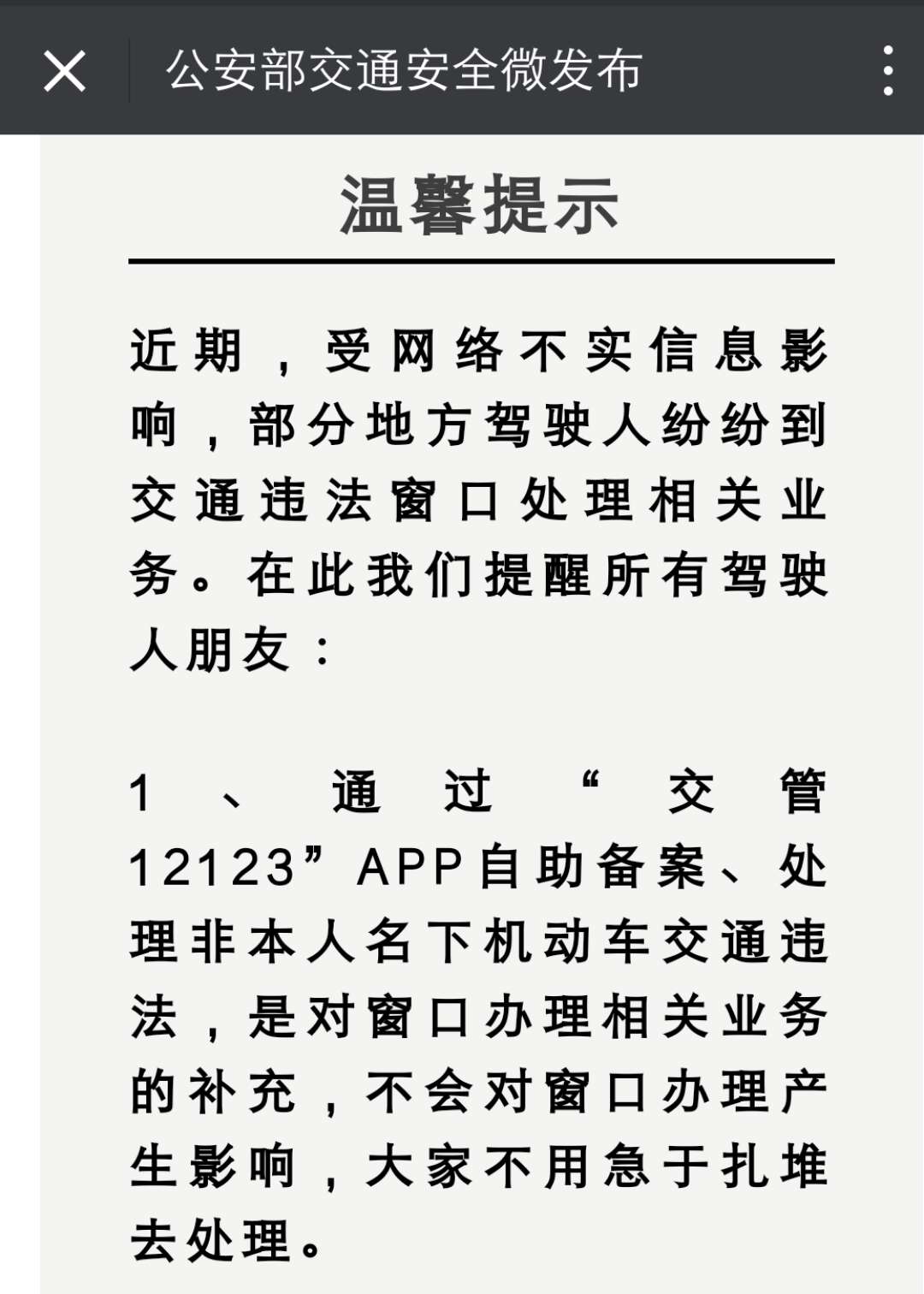 2月26日,公安部交通管理局通過官方微信發(fā)布文章,對新增項(xiàng)目推出后群眾提出的問題進(jìn)行答疑,并提醒駕駛?cè)伺笥逊Q“通過‘交管12123’APP自助備案、處理非本人名下機(jī)動(dòng)車交通違法,是對窗口辦理相關(guān)業(yè)務(wù)的補(bǔ)充,不會對窗口辦理產(chǎn)生影響,大家不用急于扎堆去處理。”同日,北京交警也通過官方微信辟謠稱“3月1日起,不綁定備案就不能處理非本人名下車輛違法”系誤讀,并提示:在北京市,不通過網(wǎng)上渠道處理非本人名下機(jī)動(dòng)車交通違法的車主,依然可以通過各交通支、大隊(duì)執(zhí)法站窗口辦理。